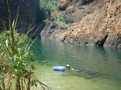 Kakadu also has a number of spectacular waterfalls - most of which were dry at this time of year. Access to Jim Jim falls is by 4WD and then a rocky walk to a beautiful plunge pool (the falls were dry). We weren't sure whether it was safe to go in the water or not and there was nobody around to ask so we scared ourselves into being cautious. On the way back we met all the tour groups who were confidently carrying towels and off for a swim - safety in numbers I guess. Just down the track, Twin Falls can only be reached by swimming several hundred metres up-river. They have nets and traps set for saltwater crocodiles but the notice says you enter the water at your own risk. |