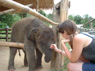 On the way to Chiang Mai we passed sign for an 'elephant hospital' so took a detour. As it happened we arrived just in time to catch the Brazil-England match. The locals are football crazy and Robin has been greeted with 'ah, David Beckham' on more than one occasion. Most of the elephants are landmine victims and have bandaged feet - by way of a donation we bought some 'elephant art' (the type painted by the elephants with their trunks). One very small and hairy 3 month old elephant was allowed out to see us, although he was pretty wobbly on his legs and uncoordinated (elephants develop at a similar rate to humans) and accidentally head butted me and knocked me over, at which point the keepers decided he was getting too excited and put him back inside. Found a guest house in Chiang Mai where we could park the car and went out to commiserate the football (at least we can forget about it now).