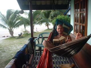 The island itself is only 6 miles long and not particularly developed, so despite the roads being little more than dirt tracks with near vertical inclines, it didn't take us long to drive up to the north west coast and base ourselves at Haad Yao beach. Our main motivations for this were simple: we could have a cheap bungalow with hammock right on the beach, the beach itself was almost empty and there is a coral reef and dive school situated there. Initially we thought we would stay for a few days then drive to another part of the island, but this didn't quite happen. 7 of the 10 days were spent being entirely lazy, the other 3 were spent diving.